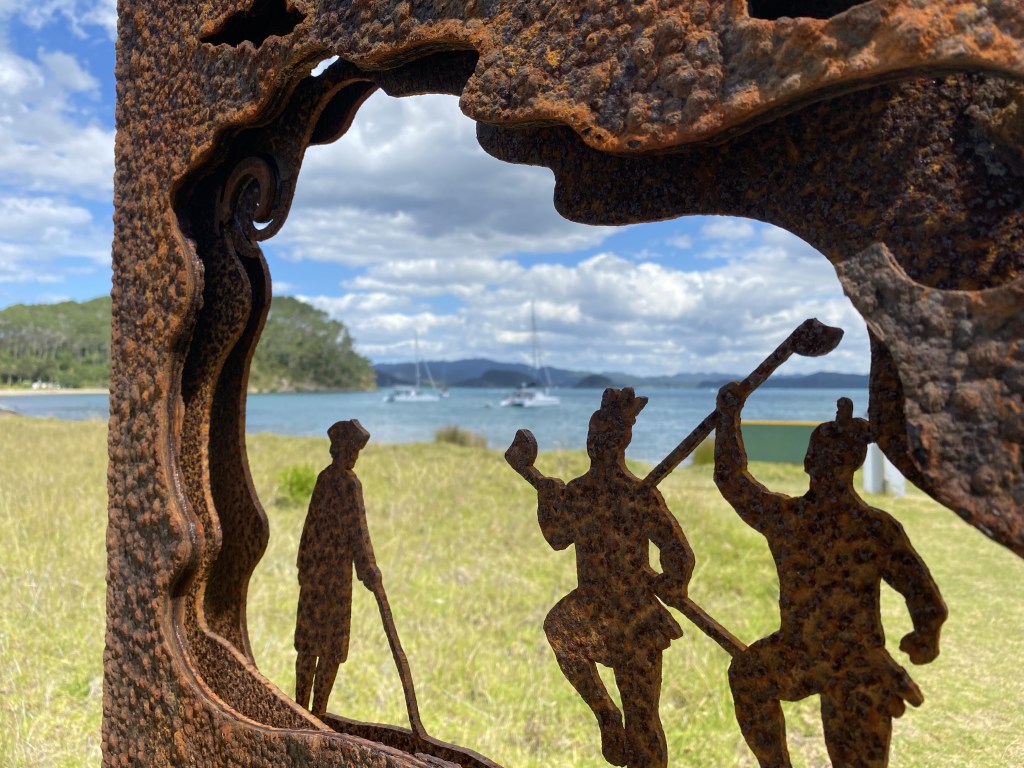 With the calm forecast, we took the opportunity to anchor near Motukawanui Island of the Cavalli Islands with its Alaskan-feeling rugged coastline and rocks, a nature reserve with a walking trail crossing it.  The Cavallis were so named by Captain James Cook in 1769 during his first voyage of discovery. In his journal he recorded that some Māori “sold us some fish–Cavallys as they are called–which occasioned my giving the Islands the same name.”  Cook probably meant trevally, which is abundant near the islands.