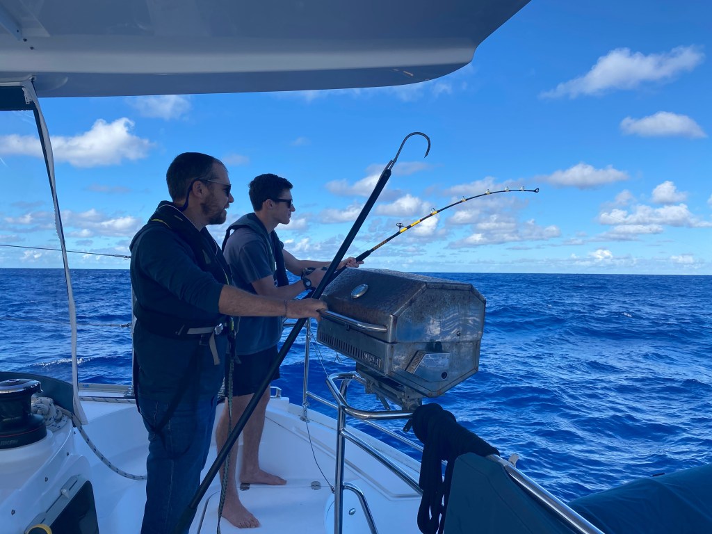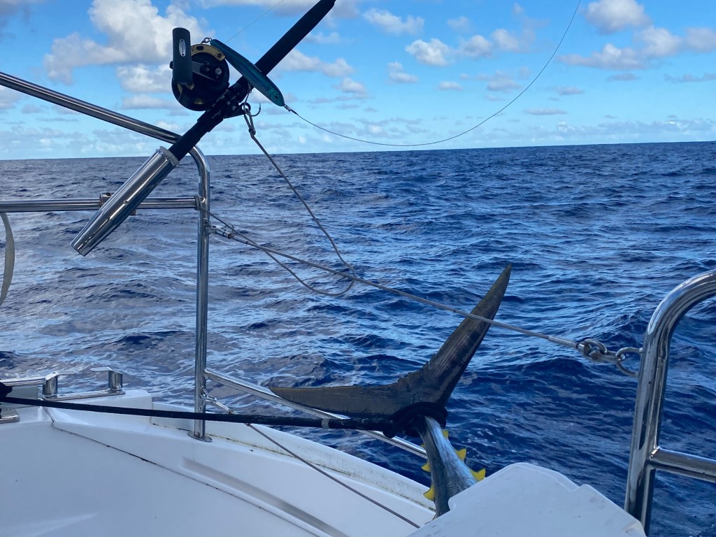 Here’s a story from Calder: Well, the goal was to catch a Wahoo, but hey, I’m not complaining! After catching a nice tuna on day one of the passage, we decided to try to get some white meat fish, such as Wahoo or Mahi Mahi. On Wednesday, a large fish took the lure and spooled out most of the line on the reel before snapping the line, but after getting the big reel rigged up, we were fishing again. On Thursday, trolling two hard aluminum lures designed to withstand violent attacks from big offshore fish and leadered with two meters of 150 kg cable, we were ready. Around 2:00 PM, the reel started its familiar screaming and clicking, and it went on doing that for a good while! Realizing that this was a large fish, the captain took down the mainsail and left just a scrap of Genoa out so we would maintain forward momentum to keep us from wallowing around in the 2 meter seas.