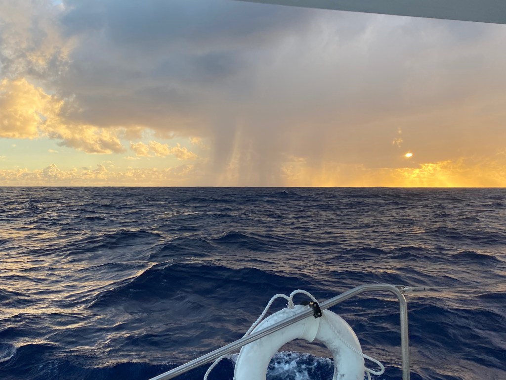 Needing to top up our batteries, but found that our generator stopped working, as cooling water wasn’t circulating correctly. We ran our boat engine, but this was a very slow and inefficient way to top up batteries. Chris hypothesized that we had barnacles in the intake. He was getting ready to clean it out, but gave it one more try and the water started circulating again; excellent! But it didn’t stay full of water, seemed to be an air lock in the raw water strainer. We “burped” our raw water strainer about every 10 minutes so that it filled with water again and, after an hour, all was working smoothly on its own. Thank goodness it didn’t need more repair out here, as Chris was feeling quite green with his head down in the bilge. We need our batteries charged for autopilot, communications, and refrigeration. We aren’t getting much charge from our solar panels, as they are often blocked by our sails and are covered in salt. It’s unsafe to get up there and clean them off in these conditions.
