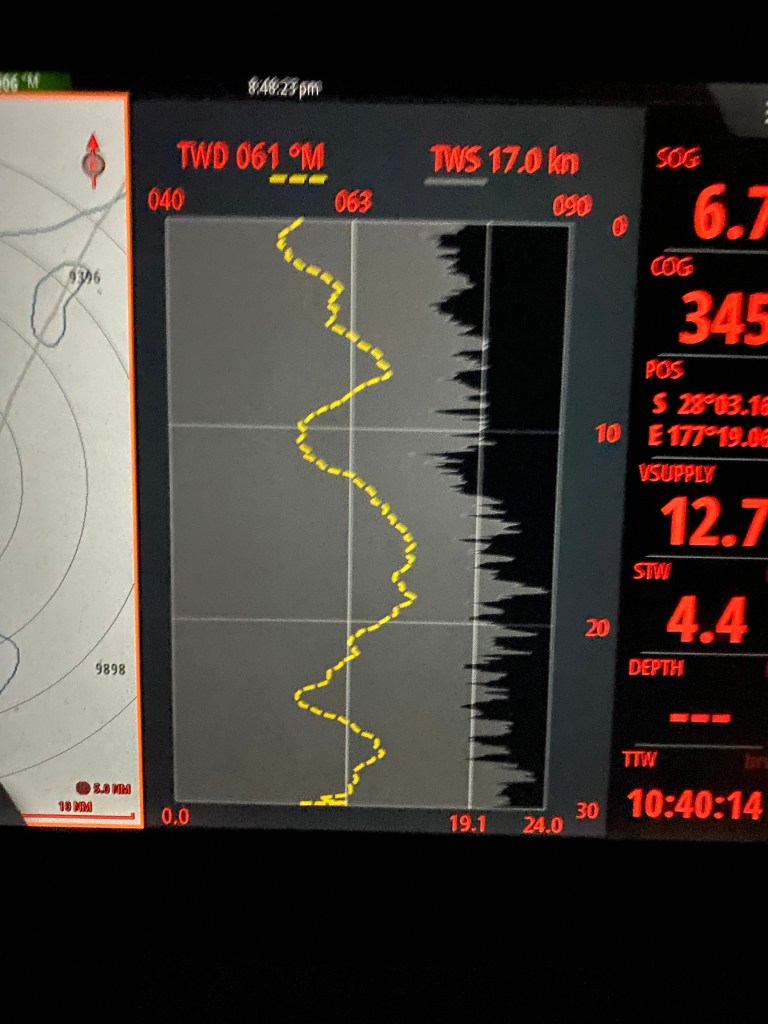 I have to admit that this has not been a “fun passage” thus far. The wind and wave angle makes for constant rolling. And the wind is making quick shifts in direction, keeping us on our toes as the True Wind Direction goes from 45 to 85. Poor Cora has not been able to do any watch shift due to needing to lay down; she’s a trooper and continues to keep us company in the cockpit and is getting plenty of food and fluids in. We find joys in every passage, but this one is challenging; we knew it would be. It feels very safe and the boat is doing wonderfully.