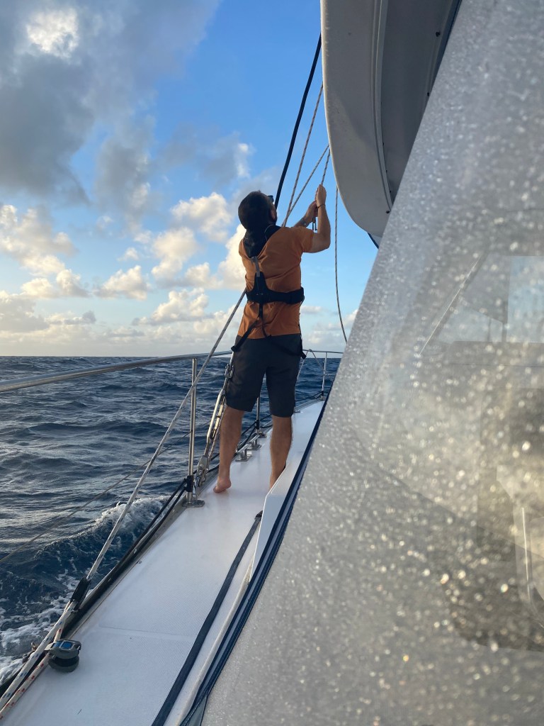 Calder noticed that our topping lift was free in the breeze; the shackle had loosened. Chris went forward, tied to jacklines (which we run on the boat for safety) and secured it. Most of our shackles are moused, but this one wasn’t. Mousing a shackle pin refers to using a piece of wire or cord to secure the shackle pin, preventing it from rotating or loosening, especially if the shackle will be in use for a prolonged period or subject to vibration. This method provides a secondary securement, ensuring the pin remains firmly in place. So much movement, vibration, and bashing takes a toll on gear. Chris will do a full boat inspection upon arrival to Fiji.