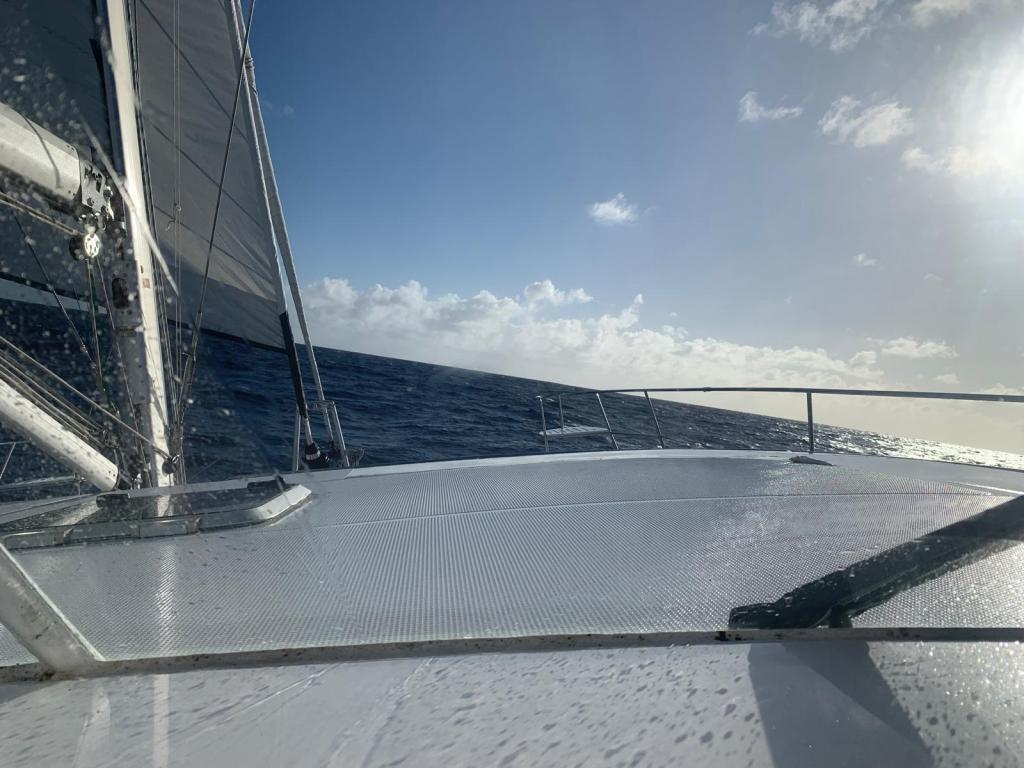 Conditions remain the same, slightly forward of the beam seas and winds, making for a chunky passage. We average 155-175 nm days. Our average speed is about 7 knots. We tend to slow the boat down at night for comfort against these waves (holding her back by reefing both the main and genoa), then let her fly more during the day when we can see and anticipate the waves. We have been reefed pretty much this entire passage due to the sea state, avoiding bashing. Our best day on the passage based on miles covered was today (175.7 nm) and that’s with double to triple reefs in!