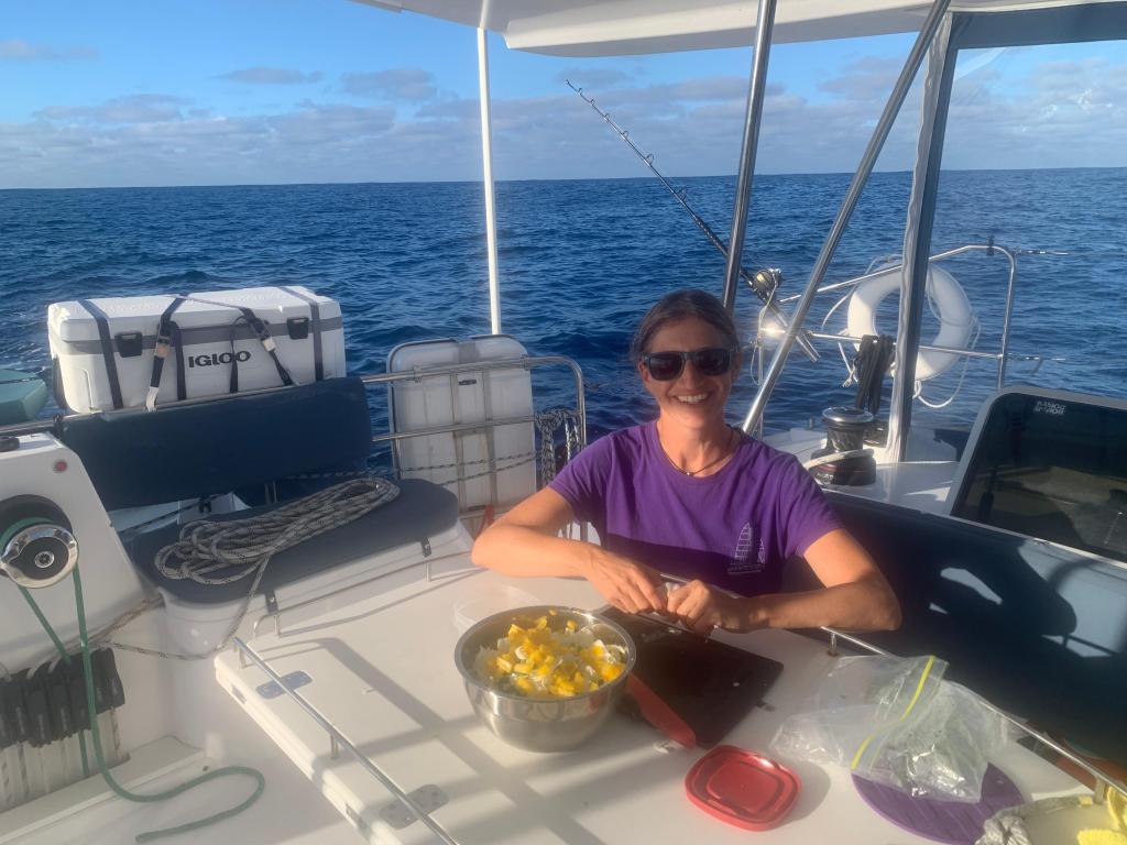 We have some headwinds and swell today, nothing too crazy. Skies are blue. In my quest to eat all our goodies, I’m making apple sauce and a clean-the-fridge stir fry.