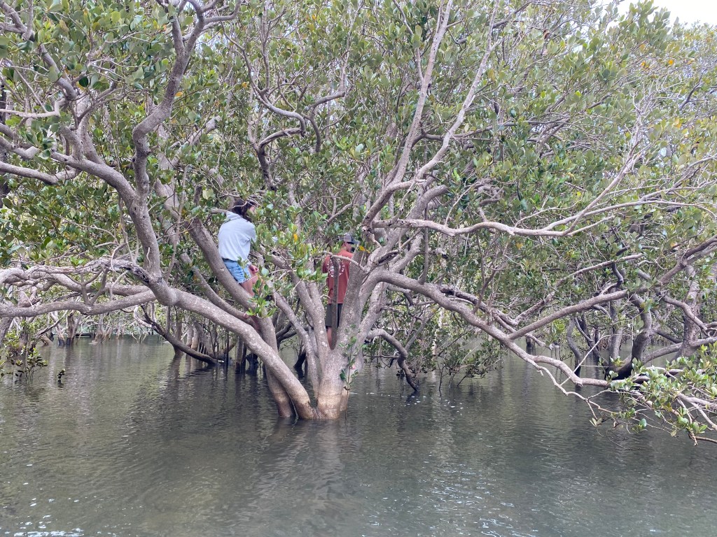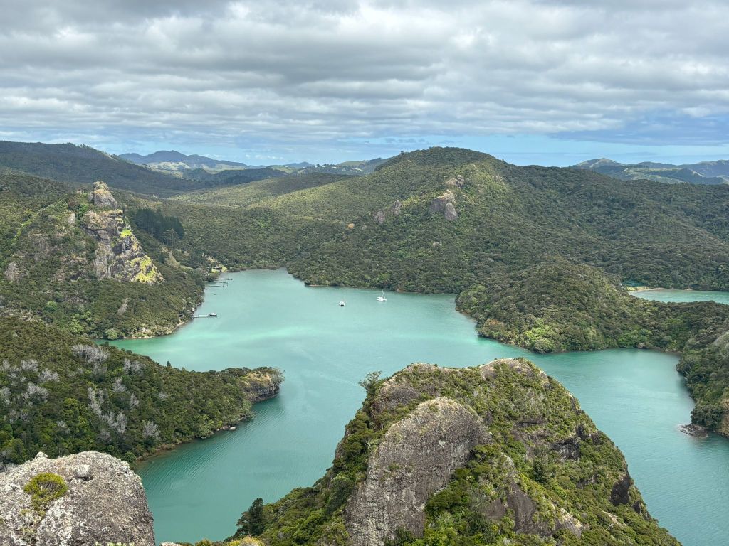 Whangaroa Harbour’s geological story began about 140 million years ago when New Zealand was still part of Gondwana and massive underwater landslides dumped mud, sand, and broken rock into a deep ocean trench, later hardening into greywacke and argillite. Tectonic forces uplifted, folded, and fractured these rocks as the land slowly rose from the sea. Over millions of years, rain, rivers, and waves carved into those weaknesses, shaping the steep harbour walls and leaving dramatic remnants like Duke’s Nose standing where softer rock was worn away. We hiked to the top of Duke’s Nose, tramped along the river trail, and took the tender for a rambunctious explore of the mangroves.