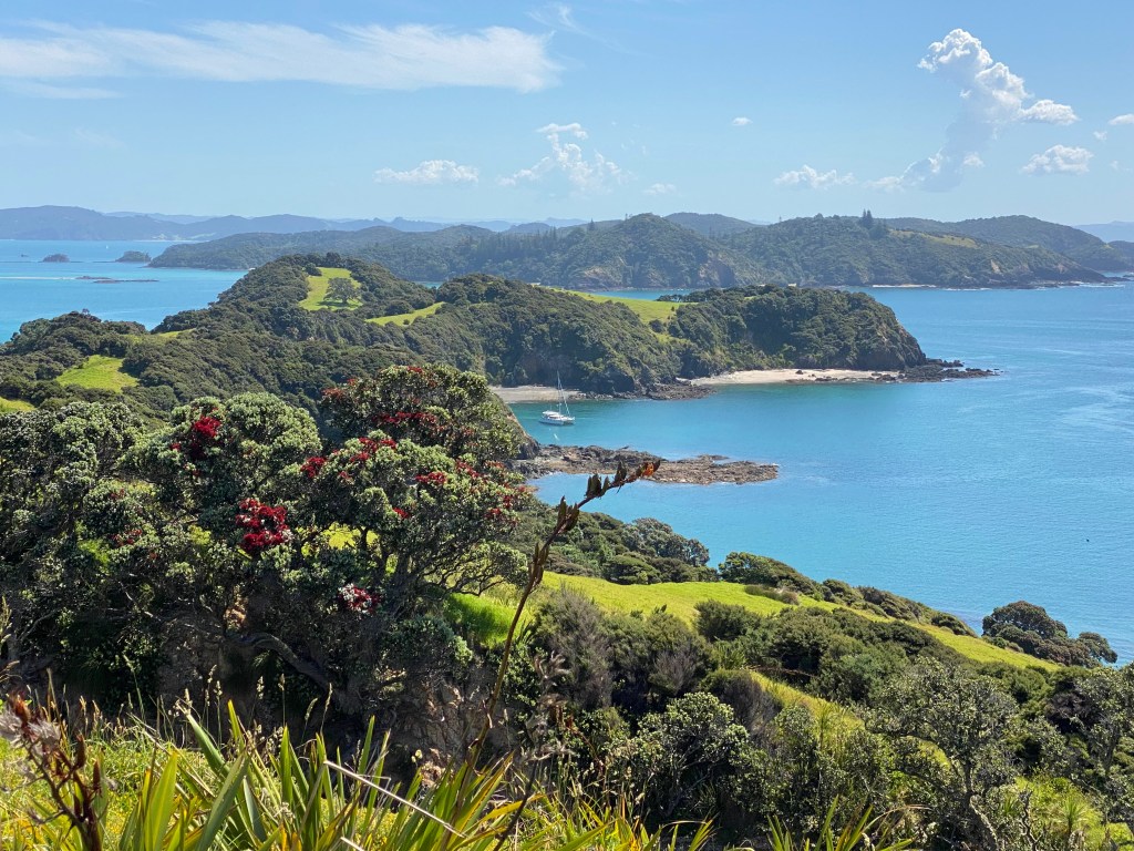 We anchor off the north side of Urupukapuka Island in the Bay of Islands. Cora dives into an acrylic painting of a waterfall as we look out at Aotearoa’s natural palette, so many shades of blues and greens, the bright red Pohutukawa flower in full bloom. It’s so peaceful here before the start of the holiday season when this place will go from a handful of boats to over 100.