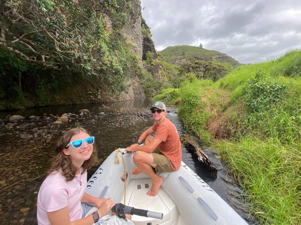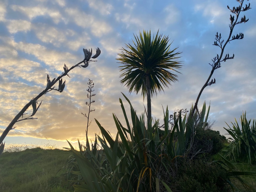 I am obsessed with the birds here and want to introduce you to four of my favorite birdy friends. The fantail flits about, dipping toward us to eat the bugs we stir up on the trails (https://www.youtube.com/watch?v=bsMl3Pjr5pE). The tui, with his white chin feathers, calls out in his R2-D2 type vocalizations, made more colorful when drunk on flax nectar. (https://www.youtube.com/watch?v=b0K1q9JriDE&t=5s). At night, my favorite bird, the ruru (or morepork owl) starts calling, their calls echoing off the cliffs. At night, I enjoy being tucked in bed whilst reading with rurus (https://www.youtube.com/watch?v=ZyLxi3o4tFQ). If we’re very lucky, we’ll hear a kiwi call out at night in the mix (https://www.youtube.com/watch?v=__4rDoA0mPU). Yes, I’m a bird nerd, proudly.