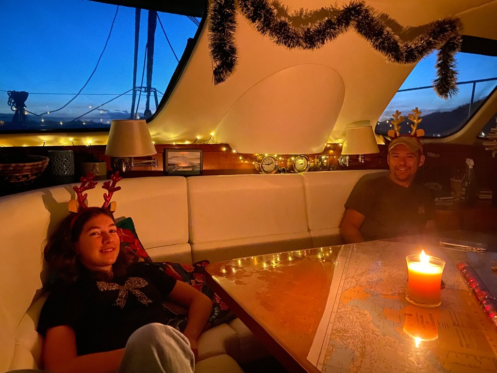 Up later on Christmas morning, a highlight for me was the kids helping me prepare a full “Thanksgiving” dinner throughout the day, from sweet potatoes to rolls, stuffing to pumpkin pie. It was quite the spread and made the boat smell good and feel cozy on our drizzly day.
