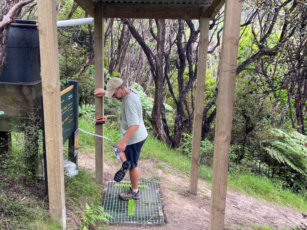 To help protect New Zealand’s iconic kauri trees from the deadly kauri dieback disease, the Department of Conservation (DOC) provides cleaning stations at track entrances so visitors can scrub and disinfect their shoes before entering and leaving forested areas. Some sections of track are closed completely for kauri dieback prevention.
